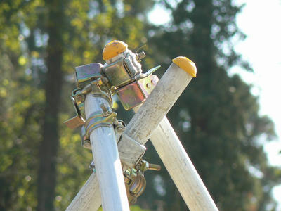 さてこの時の三脚の組み方だが、記録しておきたい。単簡パイプと呼ばれる足場パイプを組み合わせて簡単に三脚が作れるセットがある。これを使えばよいのだが手持ちのジョイントでも応急処置として使えることが分かった。やり方はこうである。