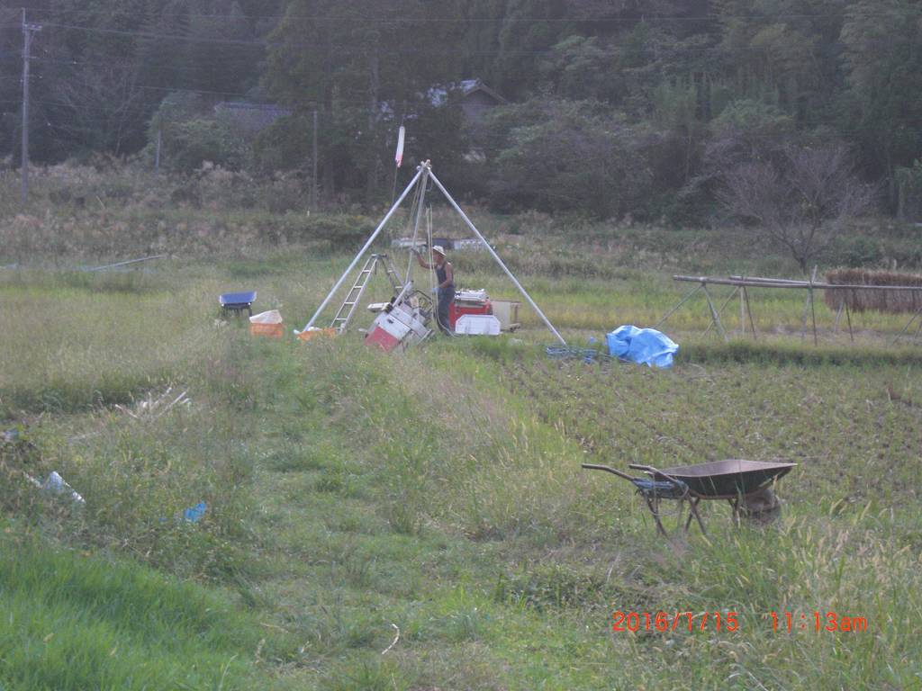 さて、この脱出に工夫が必要。過疎地で応援も期待できない。皆朝から晩までフルに動いている。ユンボを・・・などと頼めない。だとしたら自分でやるしかない、と腹をくくり調べ始めた。写真下 三脚頂点真下が転落した脱穀機