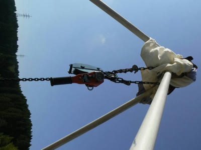 2、手持ちのレバーホイストでだ厚倫した前部を吊り上げる