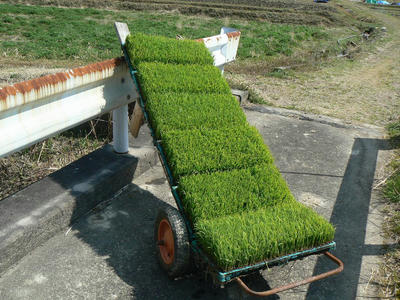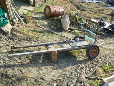 かさばるもの、例えば500Lのローリータンクなども安定して運ぶことが可能。作業台としても使用している。フレームが木材なので雨に弱い。その代わりソフトでショックに強い。防腐剤は塗ったのだが3年目で取っ手が半分くちてしまった。二台目を思案中。水稲の苗箱を載せたところ。2輪だから安定しているが畦を走ることができないのが残念。