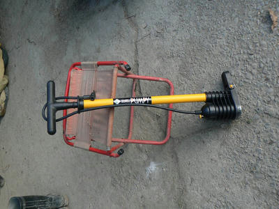 自転車の空気入れですがコンプレッサーより簡便でよい。ただ100回漕いでもびくともしないトラクターのタイヤなどには体に大変な負担となる。簡単に空気が入るポンプはなかろうか、と思って探した結果巡り会えました。1800円ほど。これこれ