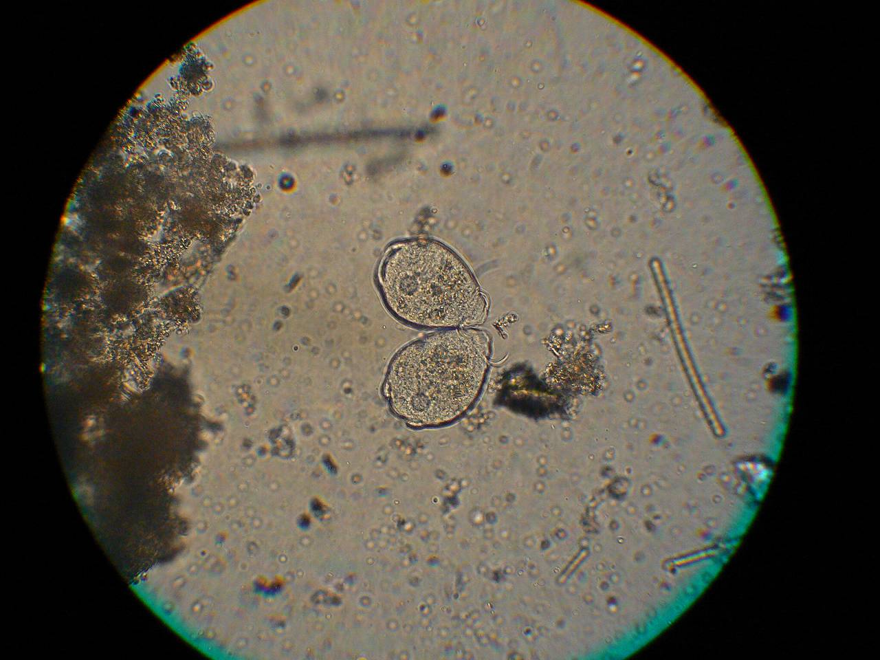 ??? これはツリガネムシの仲間が丸まった状態ではないのか。それにしても長く動かない。右の長いものはたぶん藍藻のユレモ。左は田の土。