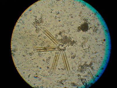 緑藻類のミドロに違いないと思うがアオミドロではないし図鑑に見当たらない。褐色の節は外部からの色素が沈着したものだろうか。肌はザラザラしており鮫肌である。畦から見ると黒色から褐色の塊に見えた。かなり広範囲に分布している。この藻類は前年化学肥料をメインにしたところだけにでている。石英の結晶のような放射物体があるが珪藻の集合のようだ。この配置は初めて見た。