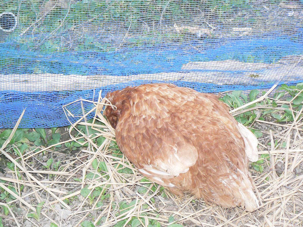 さらに次の日仲間の攻撃は激しくなり、歩みもままならないその個体は放置すると致命傷を負うのが明らかだ。そこでネットで囲ったネットご屋に隔離する。周りを仲間たちが通るのが見える、一人隔離された、という緊張は和らぐ。ひだまりの中にやすみ、少しばかり元気を得る。腰が立たなかったのに、自ら立ち上がって餌を突くこともできた。やがてまた伏す。伏せながらも水を含み、餌を突く。早く仲間のところに帰ろう、止まり木に登ろう、と思っているのかもしれない。