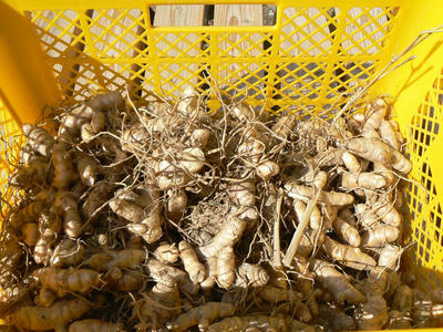 掘り上げて洗って乾かす。かなりの水分を含む。これを天日で2日ほど干すと表面が脱水して痛みにくい。