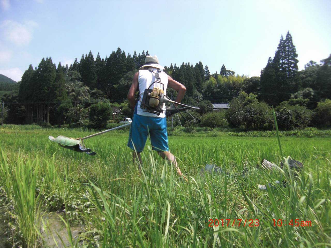 アタッチメントの泥除けが重い。泥除けの働きも顕著だがまっすぐ前に誘導するガイド機能もある。丸みのあるエッジは両サイドの稲の株元を保護する。株元株際まで雑草を刈ることができる。同じ場所で、左右の条の株元を刈るので2往復させる。刈払機の2枚刃が揚力をつけるのか片手で押すことも可能だし、押すときも刃の回転によって前に引っ張ってくれる。見た目ほど重くない。
