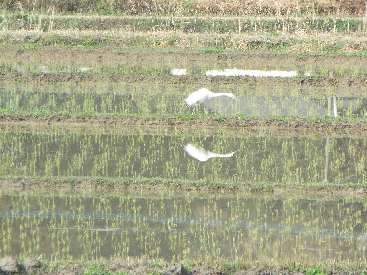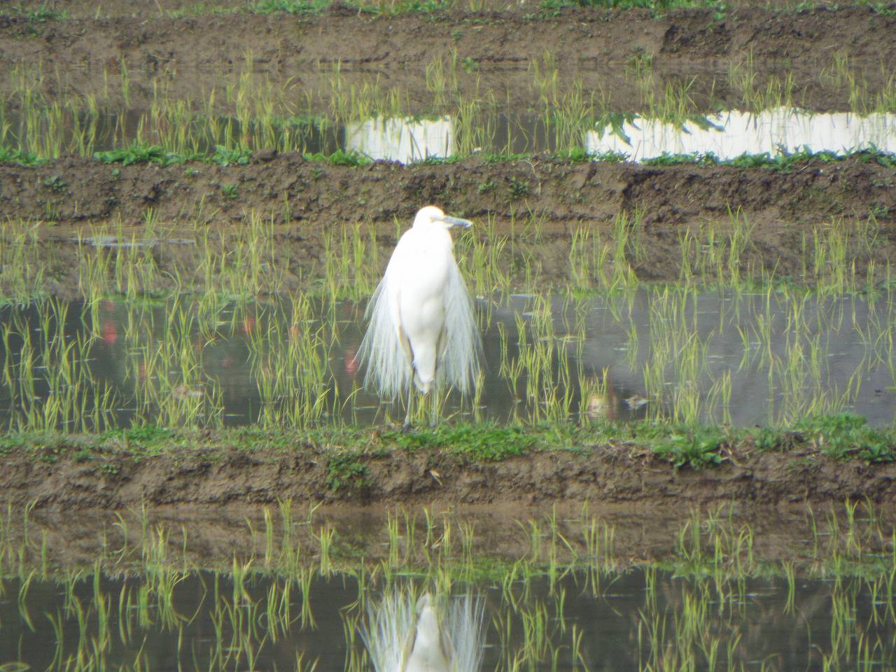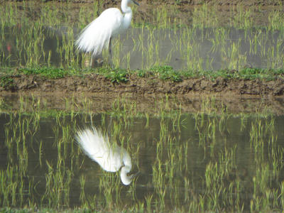 これはデジカメの50倍ズームで撮影したものでたぶんシラサギにはこちらが見えていない。田に突っ立った白い看板のようなものに気づき、確認すべくカメラを用いた。見事な容姿にシャッターを切り続けてしまった。