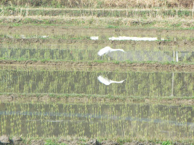 春起こしや代掻きが始まるとどこからともなくシラサギたちが集まってくる。ダイサギ、コサギが入り混じっておりアオサギもやってくる。彼らはもちろん餌を求めてきているのだがときには親しげに見事な容姿をこちらに見てほしいのではないかと思えるような、そんなときもある。