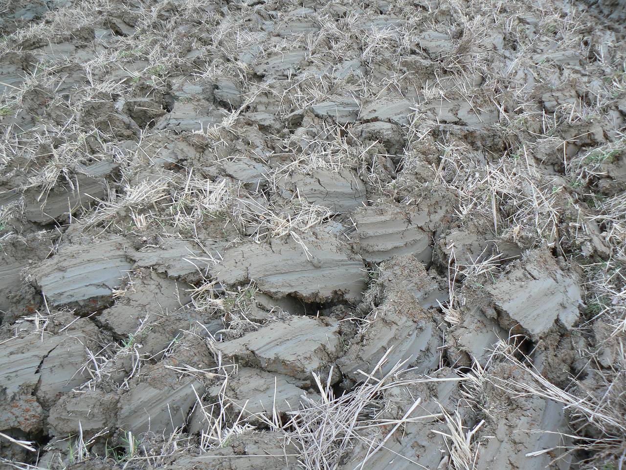 こちらまだ6年。青灰色の還元粘土層がそのまま天地返しされている。500年も田であったところのこの田の粘土が少しも土壌化しないことからみると今後の500年も同じ粘土だろうか。粘土は腐植の対極に位置していると聞いたが、瓦の焼ける純粋粘土の田では、腐植が粘土に食われてしまうのだろうか。