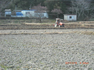 ロータリー耕作に比べて速度が速いので気持ちがいい。4-1のレンジとギア。農道を走るときの速度だ。トラクターとしてはるんるん気分。