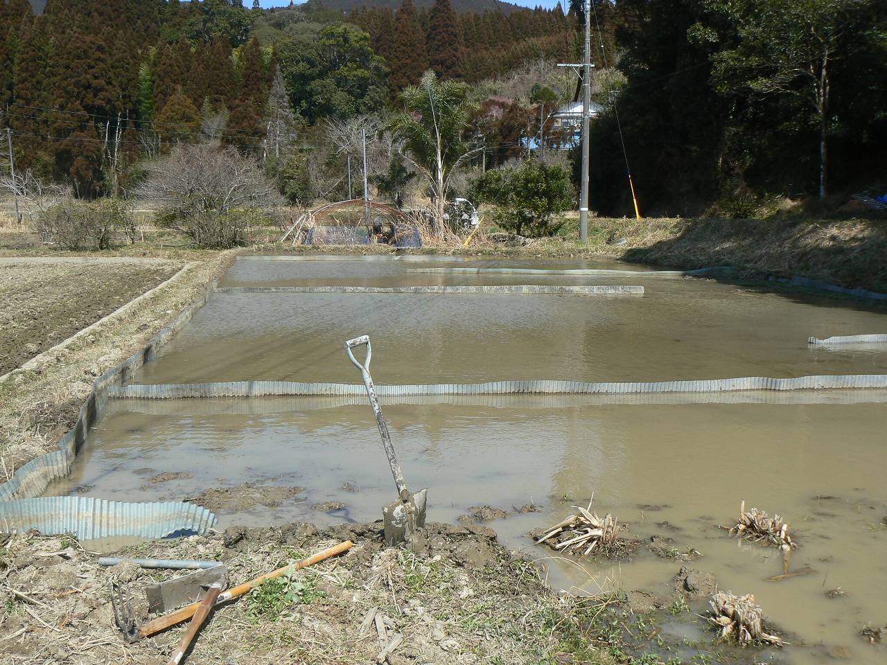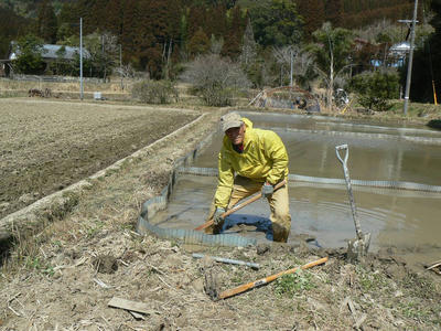 水温むビオトープの流路の整備を行う。今年も畦波で仕切りを作って五区画に分けた。マコモの苗代、普通作の苗代にも使用する。マコモの株は移植し終わっている。苗が一斉に生え揃わないように水温を考えて場所を決めた。第一区画と第五区画である。稲の苗代は第三区画に仕切りと排水設備を設ける。