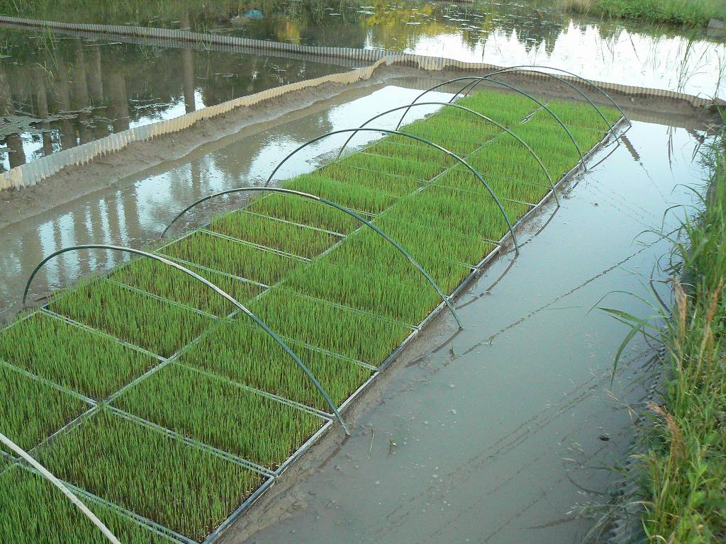しかし生育が不揃いであった。南側が何故か成長しない。養分不足であれば南側のみが成長しないのはおかしい。初期の生育ムラによって日照不足があり、ますます生育に差ができたとも考えられる。未だに原因がよくわからないが、こんなことは初めてだった。40日苗だとすでに寝に老化が始まっているので田に定植したあと生育が追いつく、ということは考えられない。苗箱の中で十分な生育が求められる。