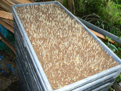 今年気づいたことがある。写真に撮り忘れたが芽より根のほうが先に伸びていた。中苗苗箱の下の穴より2,3cm伸びた根が垂れ下がっていた。ひどいのになると下の苗箱の土に根を伸ばしているのもある。初めてのことだ。芽が出揃わないからといって日時を重ねてはまずいのか、今年だけの特異な気温変動のせいなのか。3日以上の積み重ねはしないようにしよう。来年からできたらすぐにでも苗床に並べるようにしよう。