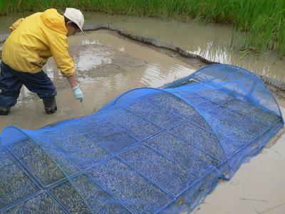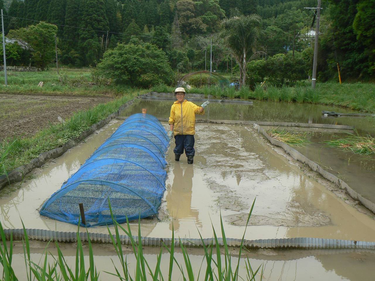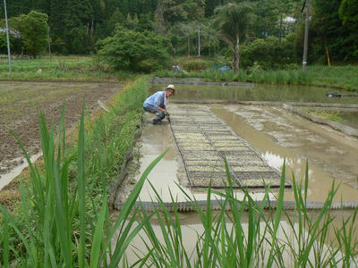 午後から養鶏担当のパートナーに手伝ってもらって苗代作りをすることになった。これは助かった、鳥よけのネットを張るので一人では苗を痛める恐れがあった。時間をかけるのでいつも半日仕事になる。二人でなら、四分の一で済む。なにより苗を運ぶ役と苗を設置する役を分けると泥濘の苗床への上り降りがなくなる。湿田はただでさえぬかるがビオトープはさらに深いのだ。足を膝上まで挙げないと畦は低いのに上がれない。48枚ならべ終わるのに僅かな時間しかかからなかった。