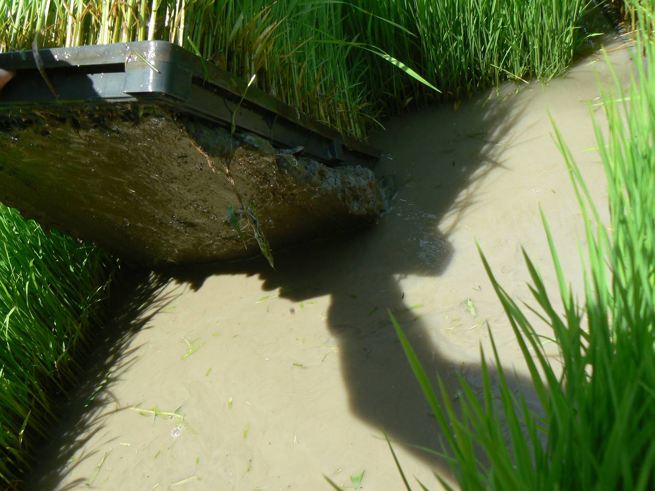 苗床から苗箱を剥ぎ取るのが一苦労。苗箱から10センチ以上根が伸びているようだ。(写真上)苗箱の面で切りそろえる。