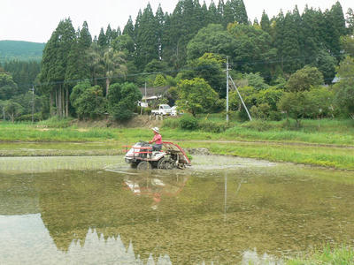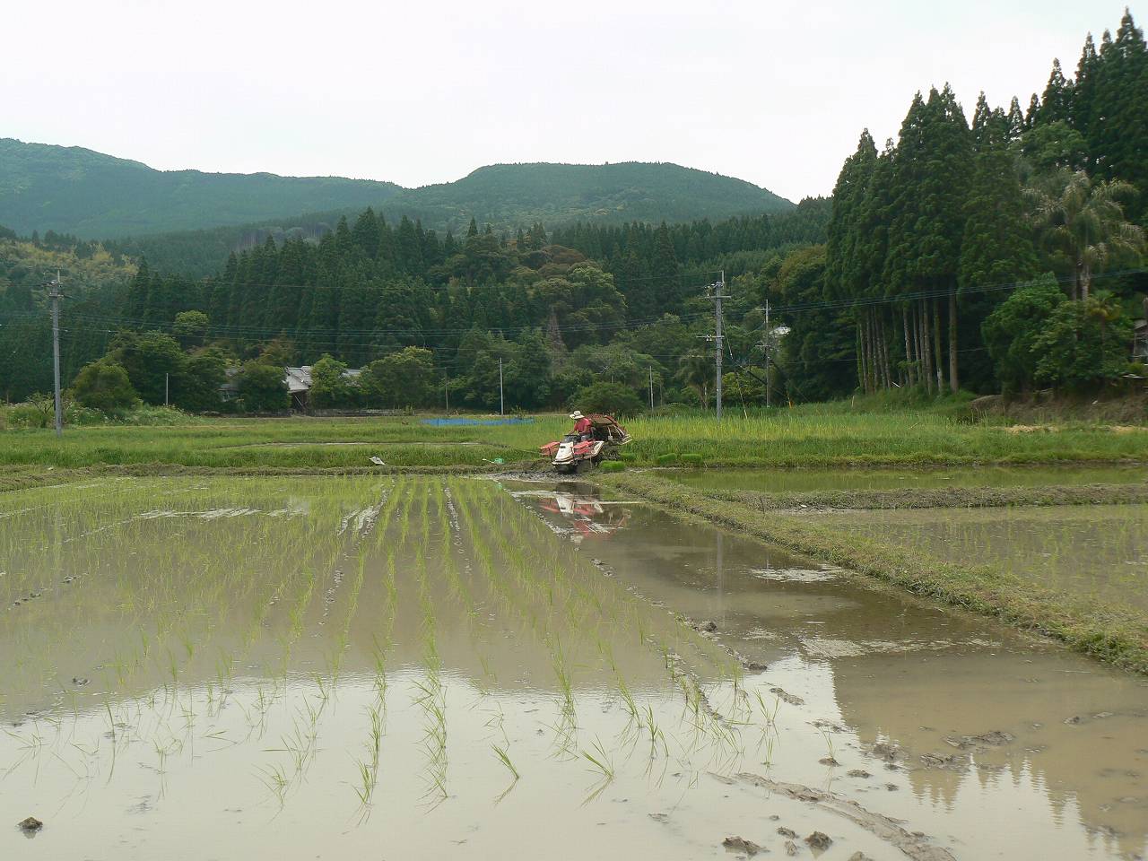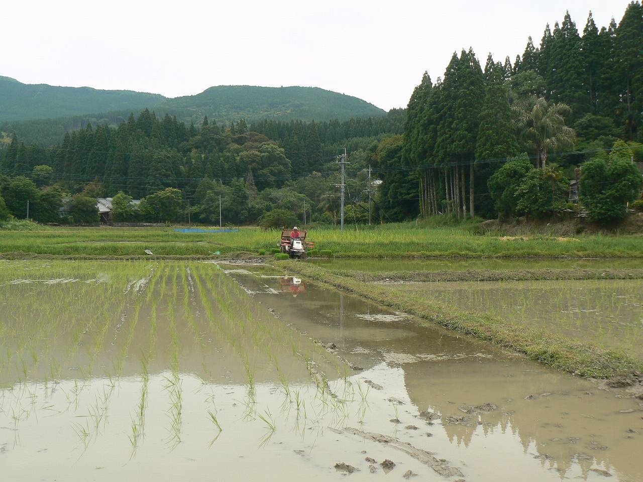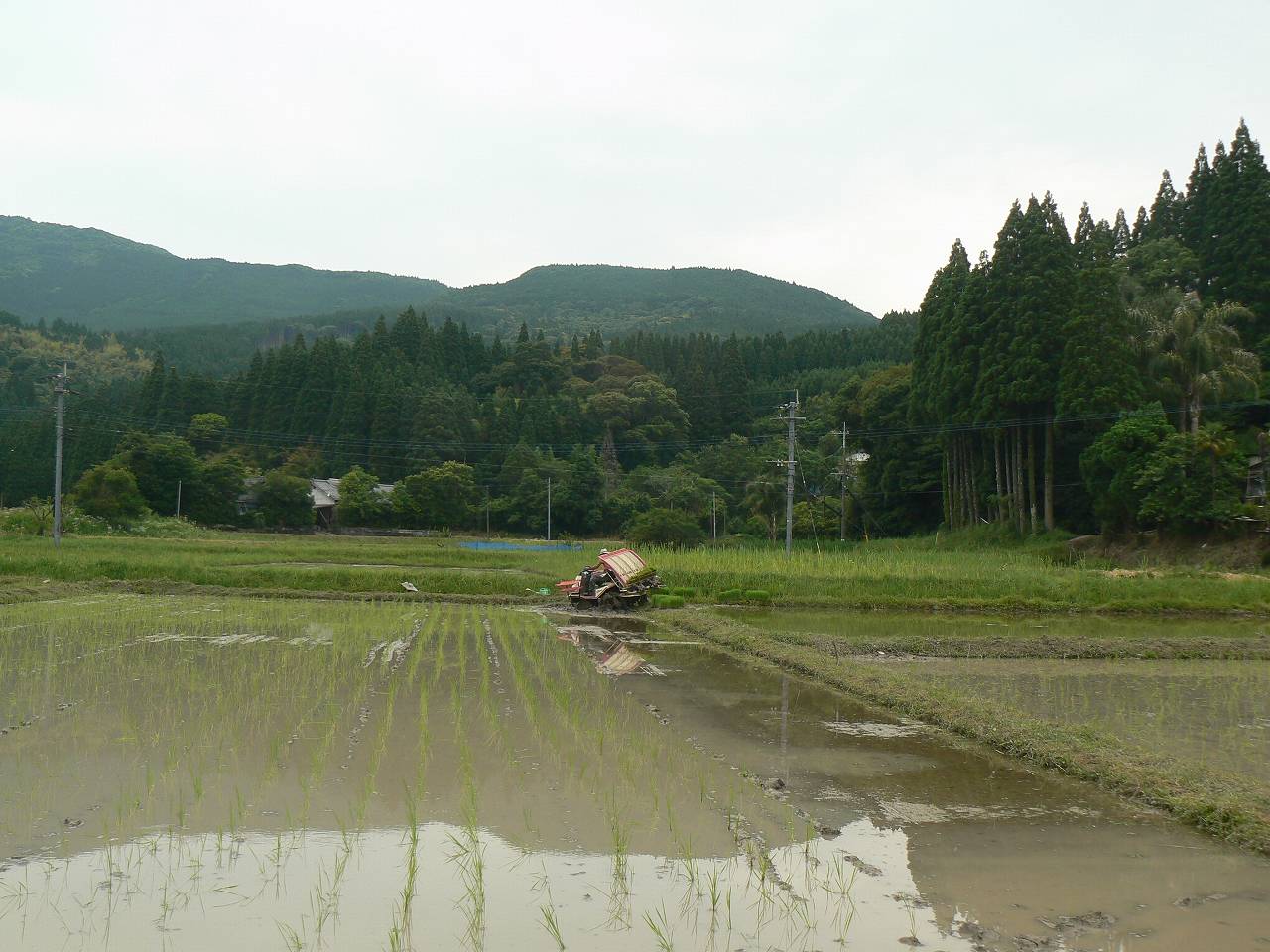 この日一日で終えたかったのだが、2反半、5枚の田植えが終わったが1枚半反だけ残った。典型的な重湿田の粘土田である。例年何かの事故や故障に見舞われる。田植機の油圧ベルト断裂やスタックである。また田から上がるにも深すぎて上がれない、などは毎年恒例である。結果としては珍しく無事故無故障で何も起こっていない。沼状態の重湿田を全部乗り切ってくれた。6号地の泥濘からどうしても上がれなかったので田植機は無人のまま車輪を回転させトラクターで引き上げた。引き上げた無人の田植機がよろよろと動き出したところでトラクターを確実に止めて、急いで田植機に飛び乗って停止させる。