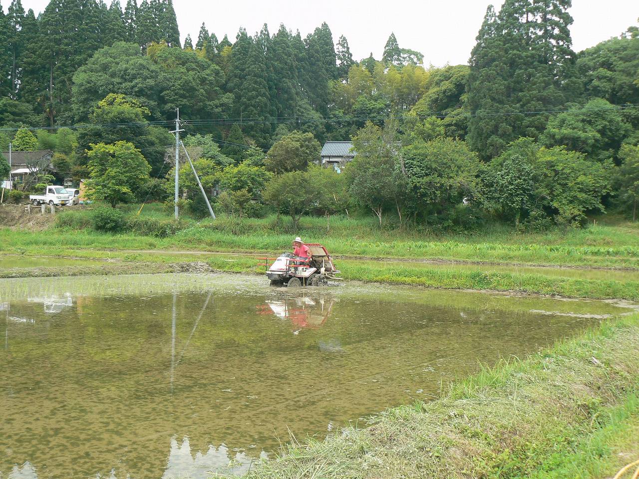 手前の田(16号地)に植えてない条が残っているがここは現在の田(15号地)を済ませてから植えるところ。スタックした場合、トラクターの救援用の通路になる。