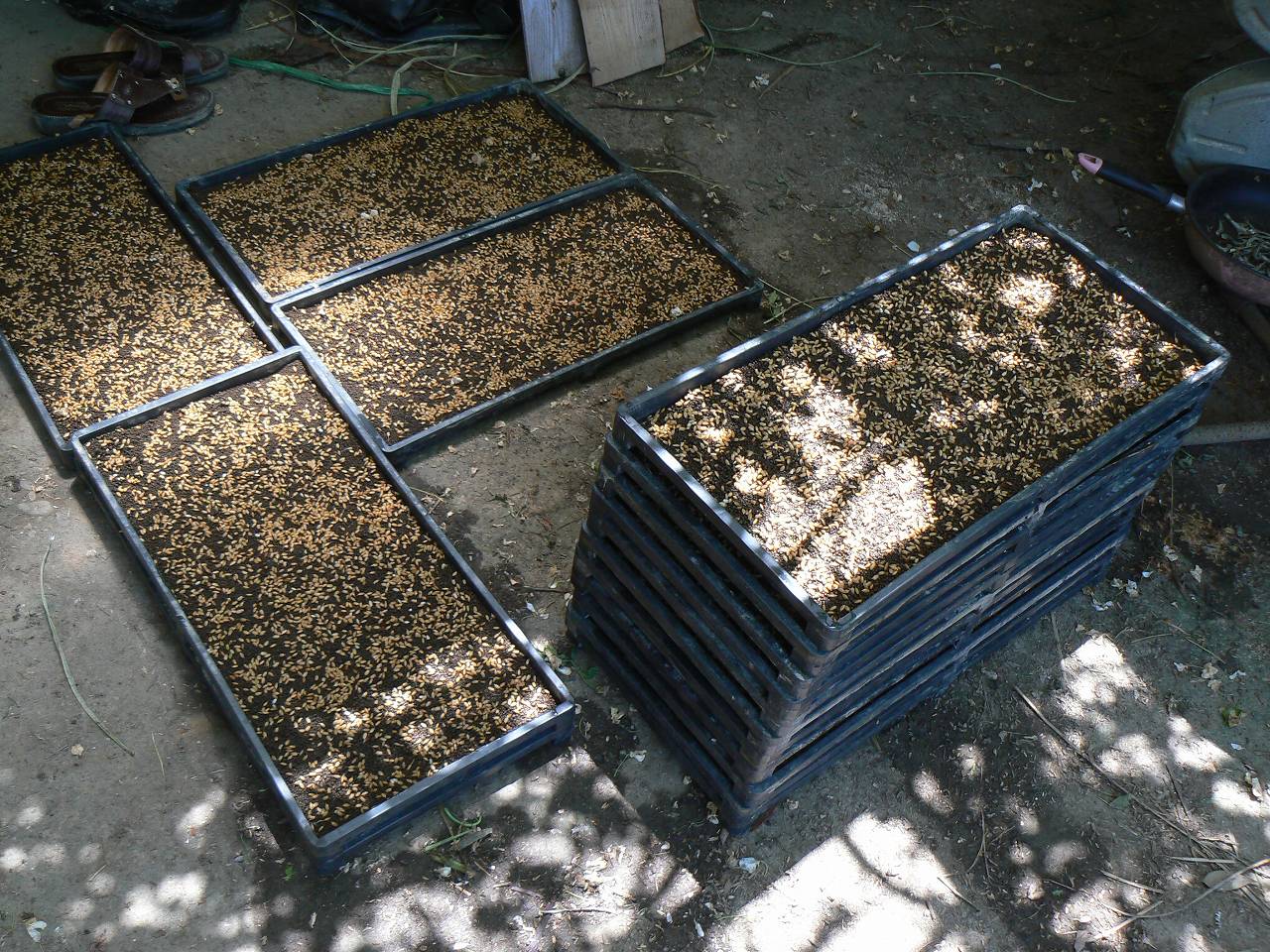 こうして48枚の苗箱に種籾が播かれ、24枚2山積み重ねて芽出しにかかった。中苗用の苗箱は構造が弱い。年々山が傾いて崩れていく。今年あたりが寿命か。