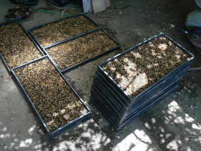鳩胸状態が7割。タオルを播いて脱水。準備した苗箱に100gずつばらまく。旧式の機械もあるのだがこの枚数であれば手撒きが速い。もっともパートナーのスキルによるのだが。筆者はだめ。機械でないと。