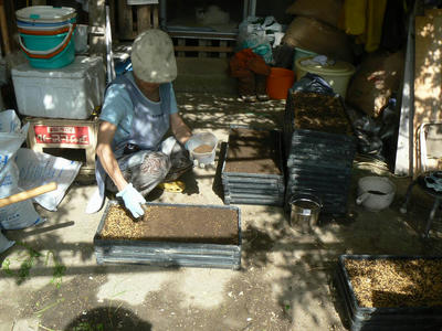下写真 すでに種籾の消毒浸漬を終り苗箱に播いて重ねて芽出しをしようとしているところ。苗箱に白藤の花弁が散る。
