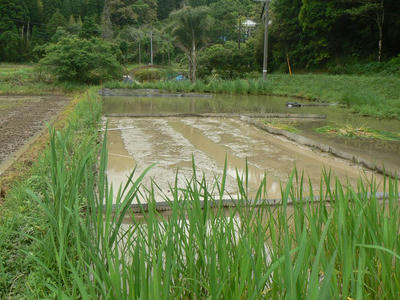 同じく5月8日。下写真 畑の準備を優先して狭いながら苗床の準備がなかなか進まなかった。ビオトープの一角に設けているのだが除草をしたり周辺を整えるのに時間がかかった。そればかりか苗床の除草もできず、とりあえずはびこった自生マコモを抜きまくり、アイガモンで除草しつつ表面だけをトロトロにした。泥縄もいいところだ。来年から早めに準備できるように除草はビオトープを優先しよう。