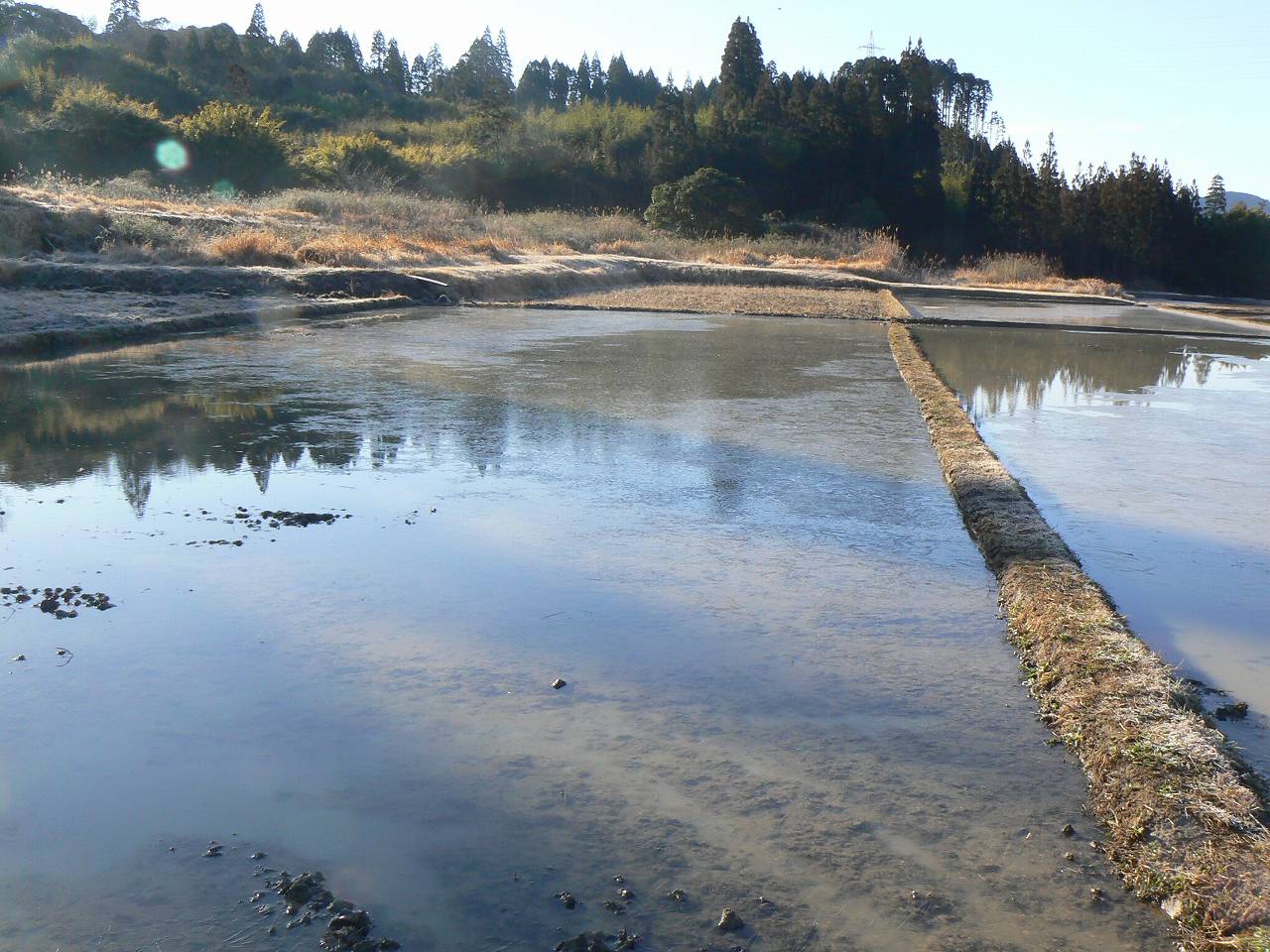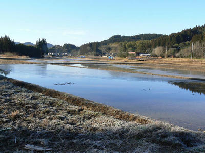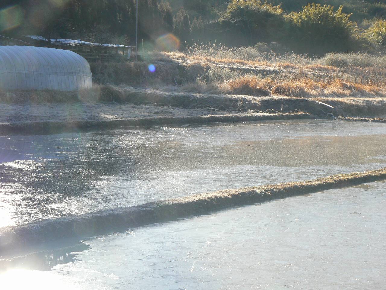 田植えをしたあと結氷することがある、といってもなかなか頭に描けないと思うので昨朝の風景をご覧ください。ぼくは思うのですよ。自分が寒いんだから苗も寒かろうと。成育に良いわけがない。それでうまいコメを作ってくれとは虫が良すぎる、などとも思ってしまいます。