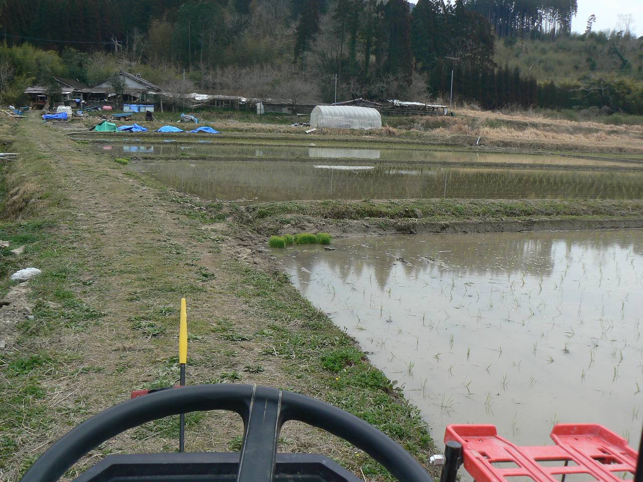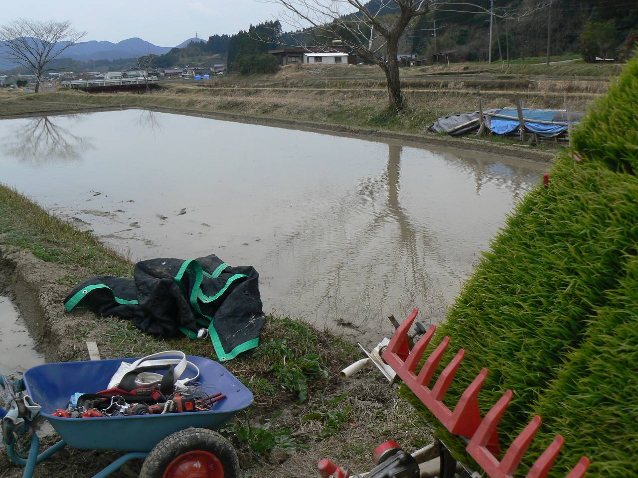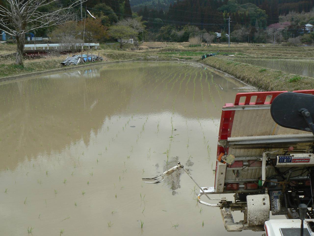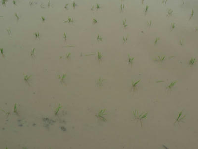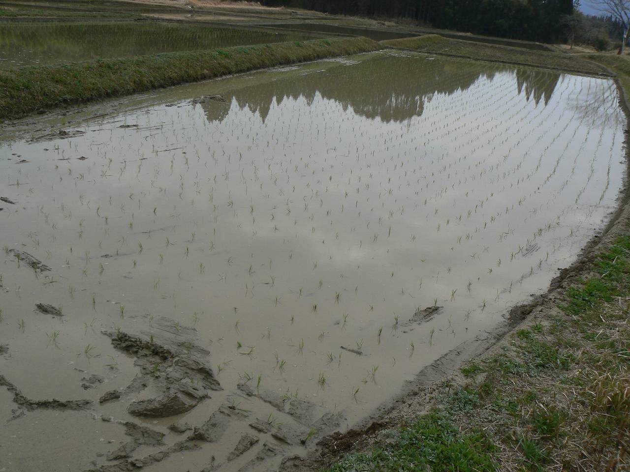 あっさりと、これで早場米の田植えは終わった。曇り空だが心は晴れ渡る。この地区では最初に初めて最初に終わったようだ。補植はこれからだが、手を入れるとしびれるほどの水の冷たさが続いている。せめて晴れた日でないと厳しい。幸い苗の成育も遅いし、雑草の発芽も遅れる。まあ、のんびり行こう。これが早場米の良いところだ。さっそうと家に帰る。