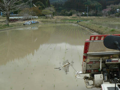 ギアを合わせる。ちょうど坪80株という設定ができるようだ。これを半分にするのだから、40株が可能かもしれない。前日1日を田植機の調整に当てて株間変更をした。この日18日は午前中から株間25cm田植えを開始した。ここはもち米の峰の雪。水が抜けきらないがなんとかなりそう。やってみた。31と25cmの差異は見た目には殆どない。どちらも一見して疎植薄植とすぐわかる。使用枚数はほぼ同じ。なぜか。1株あたりの本数を減らしたからだ。稚苗3~5本。経過と結果がどう出るか楽しみだ。