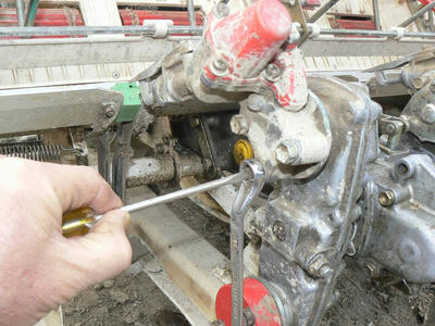 爪の取り外しと位置調整 グリーンのチェック用のスケールにほぼミリ単位の精度で調節する。1ミリでも上下すればそれだけ苗の掻き取り量が異なって来るので田全体では苗箱の必要枚数が大きく違ってくる。苗の掻き取り爪は強く鋭いので誤るとこの写真にある緑のスケールを簡単に砕いてしまうほど。うっかり手を出そうものなら骨を砕いてしまう。強力でしかも精度も高く実によくできている。4条植えだと各条2個、計8つの爪がある。