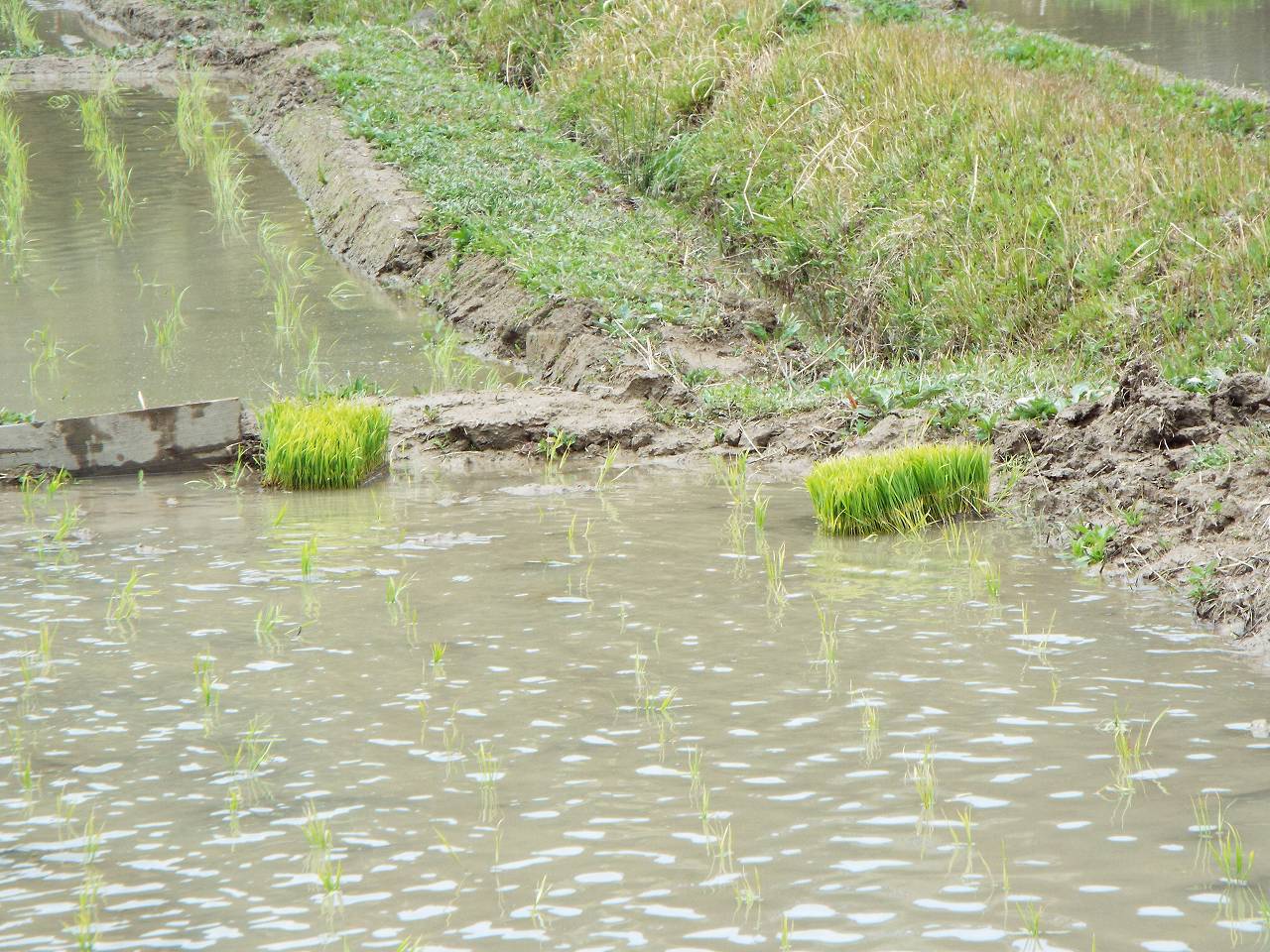 田植え機でどうしても残る四隅の田植えが必要なのだがそれが10日もできなかったわけだ。今年の苗は草丈が低い。5センチ、などというのもある。乳苗のようだ。寒さが続いたためだろう。いたるところで水没。浅水にしたり深水にしたり、霜よけには深くしなければならないが深くすると苗が沈む。朝になると水を落とす。なんとか草丈が伸びるまで乗り切らねば。