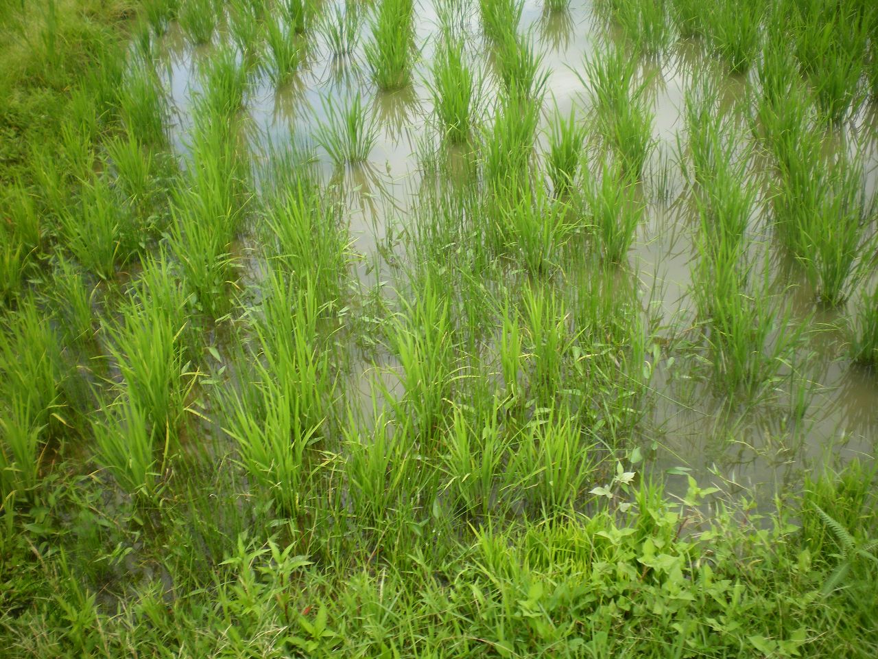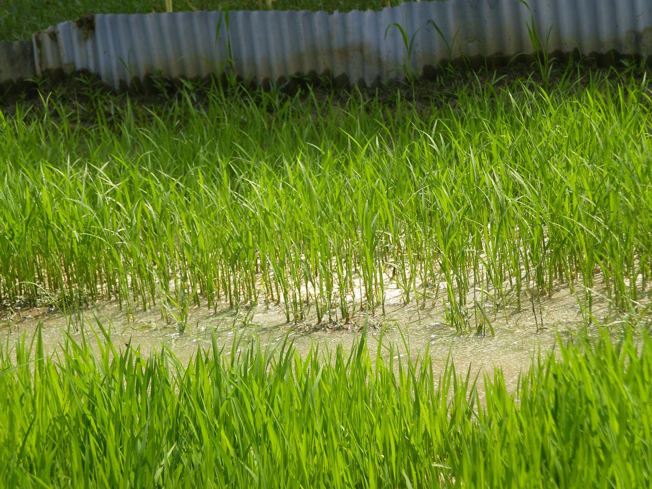写真は田植え後一ヶ月半、5月5日の9号地、田植え時の苗と殆ど変わらない。細くて衰弱した苗から消えていく。