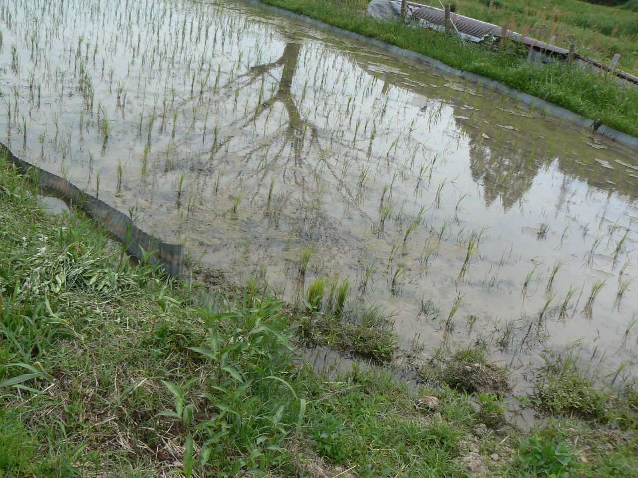 水で抑草するには最低でも5センチ常時8センチの深さに保ちたい。しかし畦の高さが5センチの田ばかりなのだ。そこで畦波で四周を塞ぐ。漏水が多く8枚目の他に至る水は半減以下。ゆるい棚田なので棚田ほどではないが畦際が極端に弱い。すぐに抜ける。そこにきて湿田の排水性を高めるために南北に溝があり、東西は土手である。畦際からザルのように水は抜けてゆく。結果としてあちこちで田面が露出し陸生の雑草に侵食されてしまう。