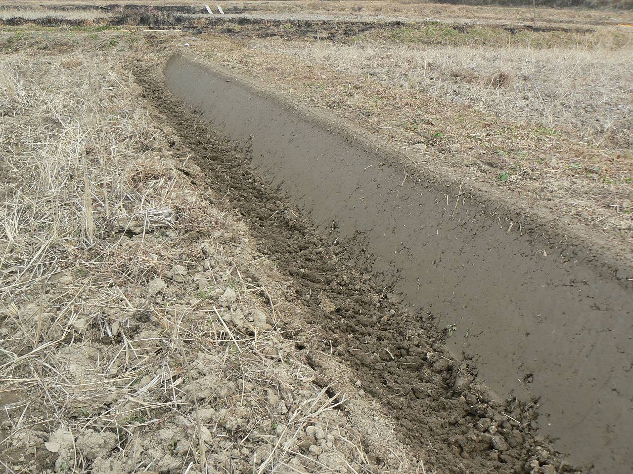 次に水路の準備。溝切り、溝上げ、溝浚い。2年でほぼ埋まるので、2年に1度はやらなければうまくない。10年を振り返るとほとんど溝掘りに明け暮れた。