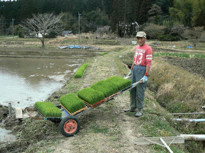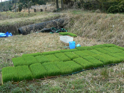 今年も早場米では自家製苗は作れなかった。厳寒の2月半ばからの苗作りにハウスの予定が立たずJAに予約することにした。3反分の苗36枚、内こしひかり18枚、あとは早生もち米峰の雪。1枚半反の当地の田では6枚に田植えをすることになる。