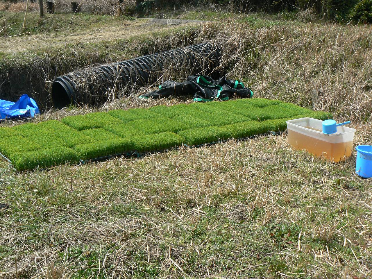 写真右側の衣装ケースに調合した3000倍希釈液にざぶんと苗箱をつける。10秒ほど置く。水切りをして並べる。この液の半分ほどがなくなる。残った液はジョロで苗の上から丁寧にかける。