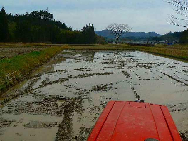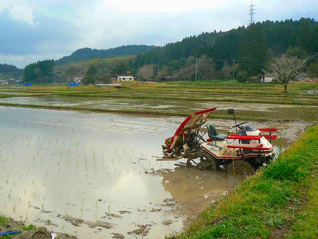 3月20は本番のコシヒカリ。今年は浅く耕せたのですべての作業が楽であった。また田植機の綜絖の歪みも、欠株も少なかった。これらはすべて重湿田の特徴でロータリーの標準位置で耕しても通常より深くなるためである。今回はロータリーをアームの一つ上の穴に固定したので深く下げようにも下がらない。これで標準的な深さとなることが初めてわかったのである。