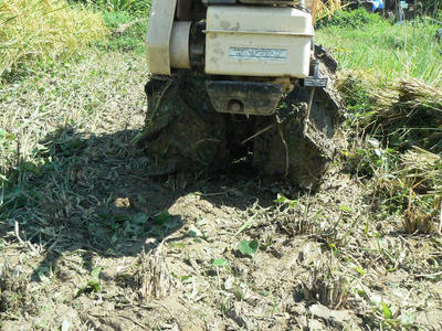土はまだ粘土をこねたような状態だが、株本のコナギが助けてくれそうだ。助走で取りこぼした株本のコナギがスリップを防ぎ無圧タイヤの荷重を支えてくれる、はず。