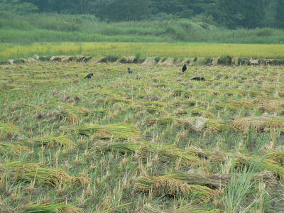 1時間で終わるはずだった21号地の刈り取りが終わったのは午後五時半であった。5分の1ほどが結束されていないようにみえる。さっそく知鳥のかーちゃん家族が来ていた。