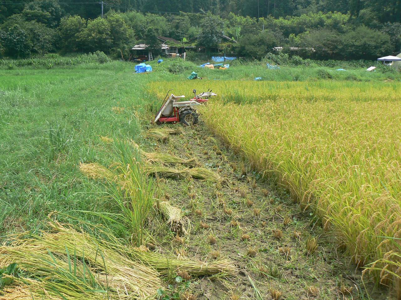 刃の隙間が開きすぎているのが原因の一つのようなのでこれをバインダーから外して研ぎ、隙間を調整して取り付けた。丁度照りつける太陽を避けて藤棚の下での作業が心地よかった。3時から田に戻って試運転、やはり結束ミスは出るのだが午前中の半分程度である。少しは回復しているようなのでそのまま突っ走り、なんとか刈り取りを終えた。明日の午前中にでも修理をしてまた稲刈りに復帰させよう。