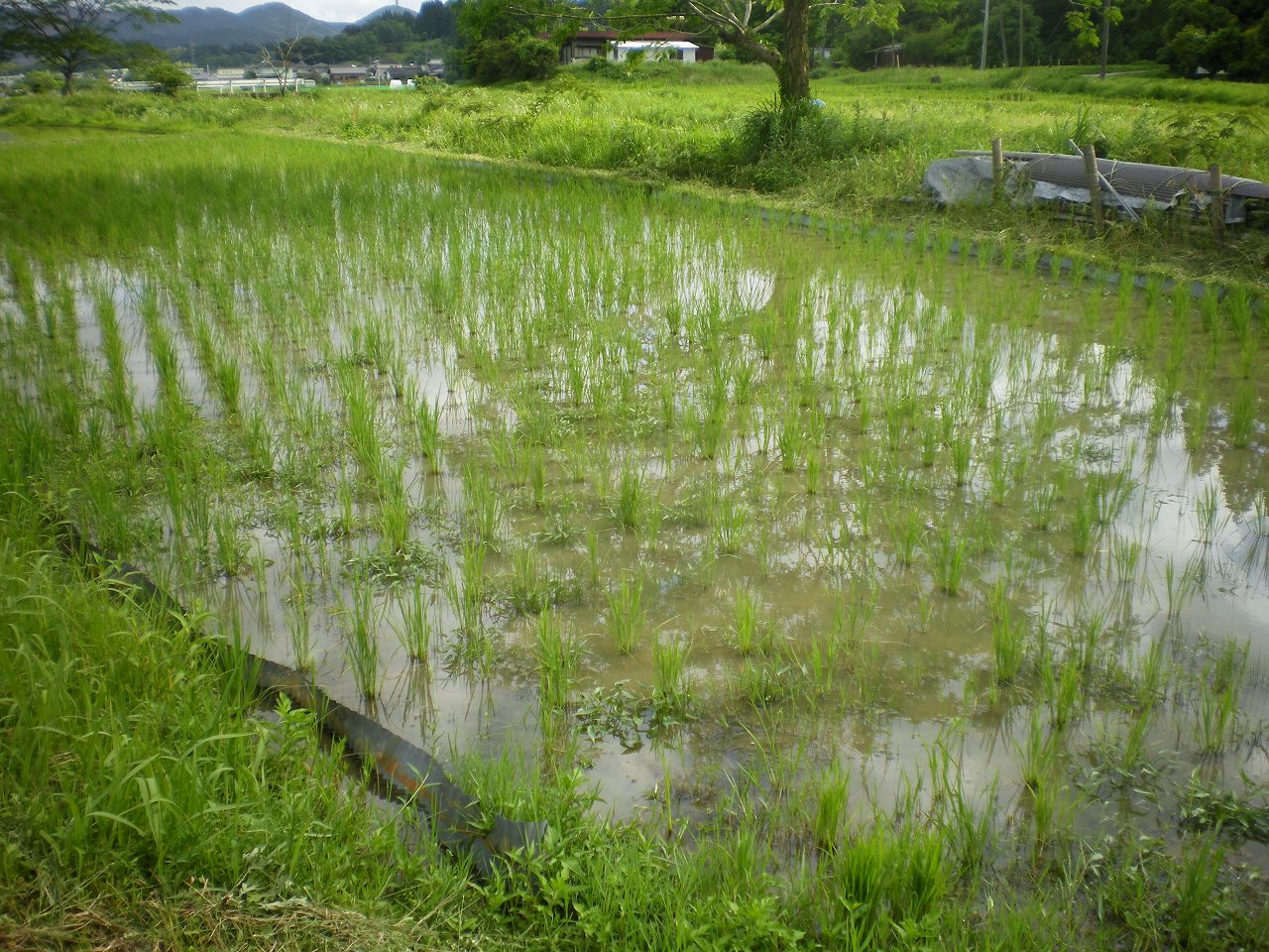 問題は雑草だけではない。それどころか早場米田植え直後では寒いので雑草はまだ少ないのだ。そのかわり、田に氷を張らせる低温が襲う。3日ほど氷が張り結果として霜の害に見舞われ、葉が赤くなり、ほとんどの苗の葉が生え変わった。回復までに2週間ほどの遅れを見た。ふつうこれで立ち直るのだが、今回は違った。根の働きが回復しない。水が少なかったので多分低温障害を受けて根の生育が悪かったものか。いや最悪だった。原因は低温だけではないかもしれない。とにかく様々な環境要因が作用して根が張らなかった。その最大の原因はやはり耕深が浅かったせいであろう。そのうえで水も少なかったので低温障害のダメージがひどかったと思われる。以後、生育を見ていると養分をほとんど吸収できていない。葉の幅は細く、ちぎれてしまい、分けつは僅かで、草丈も伸びない。田植え後1月半というものはほとんど生育を見ていない。気温が上がり始めて少しずつ伸びてきたが細苗が細いまま伸びていくだけであった。すき込んで普通作でやり直そうか、と何度思ったことだろう。