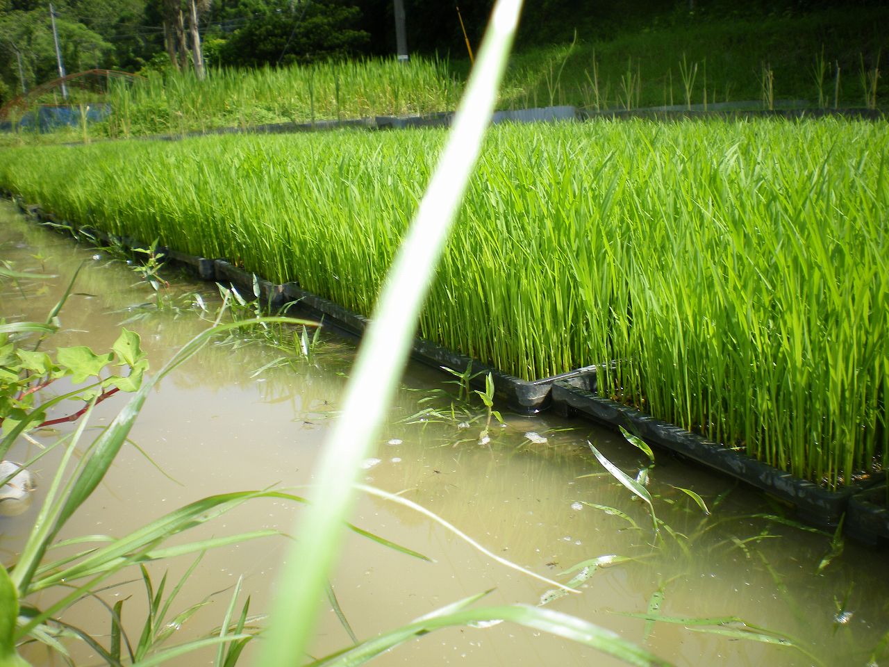 五月末の同じ頃、一方では普通作『ひのひかりの苗』が生育している。2反4枚の田に50枚の苗箱を用意した。補植を減らすために1株の本数を増やすことにした。マット苗では1,2本の株が育つことはないと判断している。一株あたりの本数を減らすことは即消滅に繋がる。1株の本数を減らすことでやってきたが、結局この田植機を使う限り中苗では1株あたり3~5本が必須と思われる。