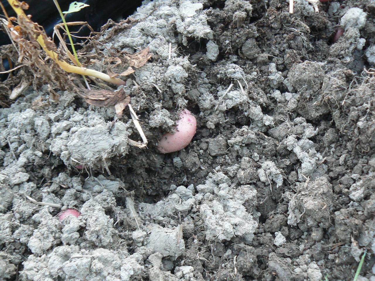 上写真の土を注目。去年までは土塊の中のジャガイモを傷つけないようにそっと竹べらや移植ごてで粘土の泥を外した。考古学遺跡の発掘と同じだから発掘と呼んでいる。表皮が呼吸できないから茎が枯れると即芋が腐った。芋には年度がべっとりとくっつくか、乾いた粘土に固められていた。粘土をはがすのに苦労するのが年中行事であった。今年は水分の多い畝の下のほうまでさらさらしている。つまり空気が通っている。どうしたというのだ。