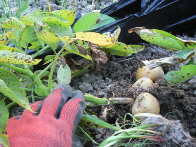 上写真の土を注目。去年までは土塊の中のジャガイモを傷つけないようにそっと竹べらや移植ごてで粘土の泥を外した。考古学遺跡の発掘と同じだから発掘と呼んでいる。表皮が呼吸できないから茎が枯れると即芋が腐った。芋には年度がべっとりとくっつくか、乾いた粘土に固められていた。粘土をはがすのに苦労するのが年中行事であった。今年は水分の多い畝の下のほうまでさらさらしている。つまり空気が通っている。どうしたというのだ。